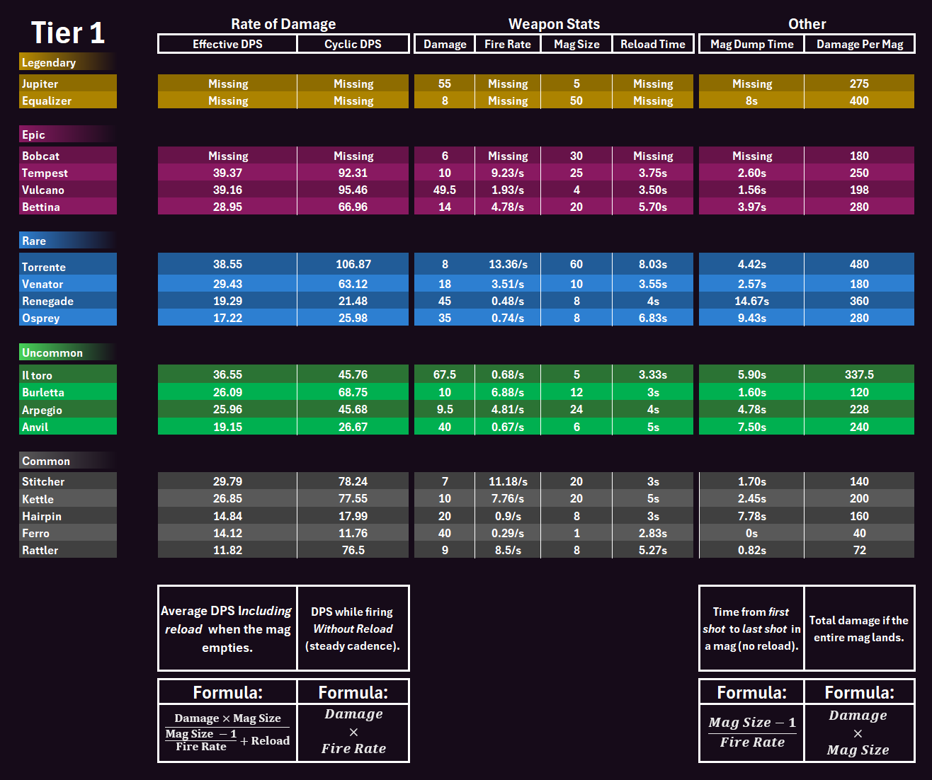 High DPS. Effective at short range against raiders and lightly armored ARC. Can be modded with a cheap extended mag, adding 5 bullets to the base of 20.